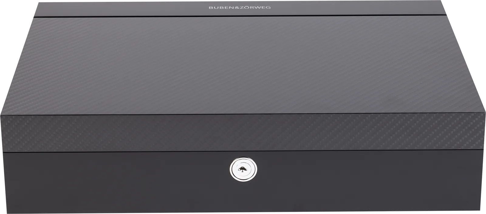 - Handgefertigtes Gehäuse in schwarzem Seidenglanz mit Carbon