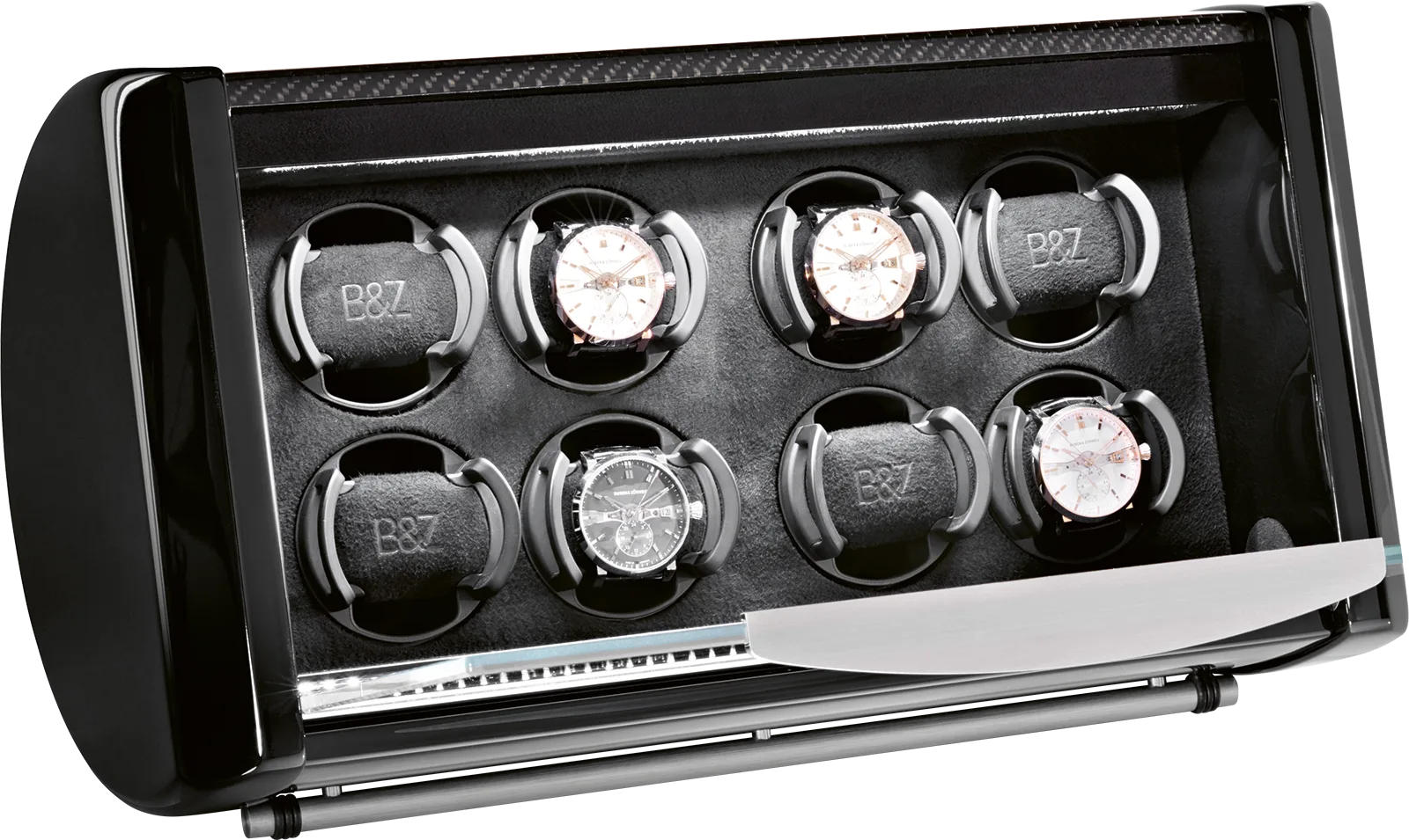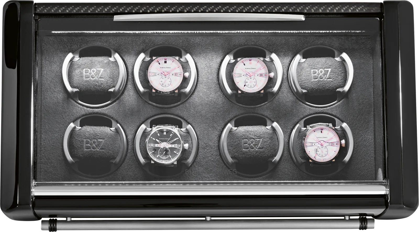 Der unverwechselbare Rahmen des SPIRITS entsteht aus einer perfekten Kombination von Aluminium, Edelstahl, Hochsicherheitsglas und verschiedenen, individuell wählbaren Außenmaterialien. Diese einzigartige Mischung aus hochwertigen Materialien betont die luxuriöse Anziehungskraft des SPIRITS sowie seine Funktionalität als führender Luxus-Uhrenbeweger.